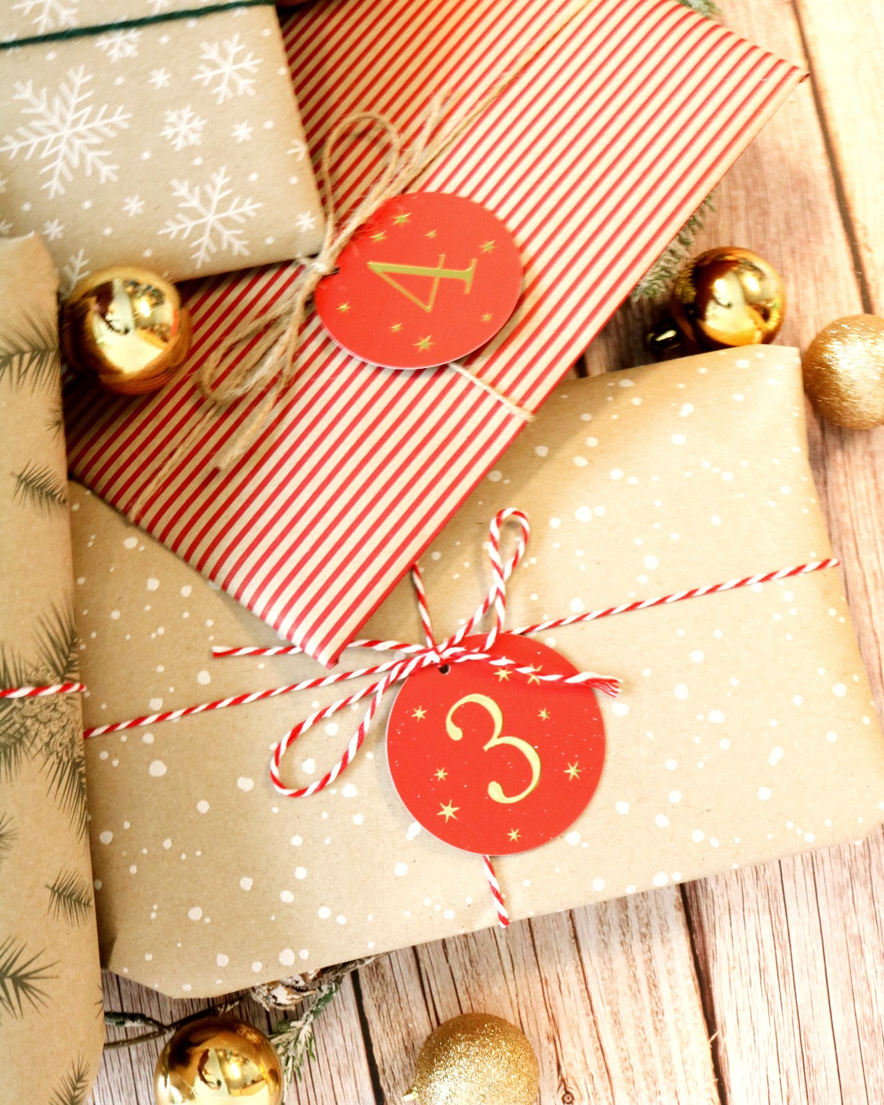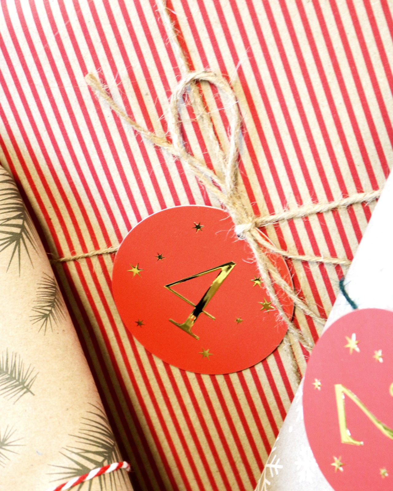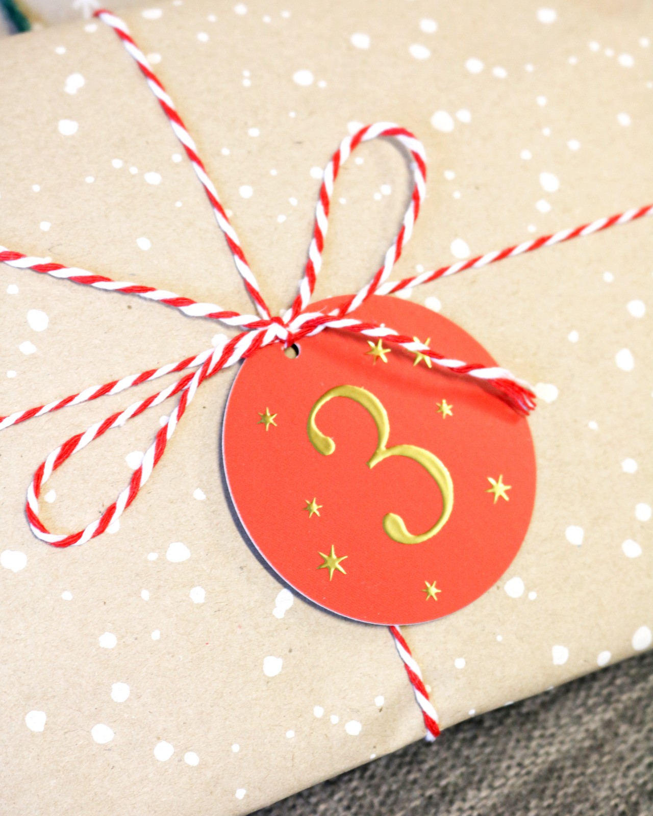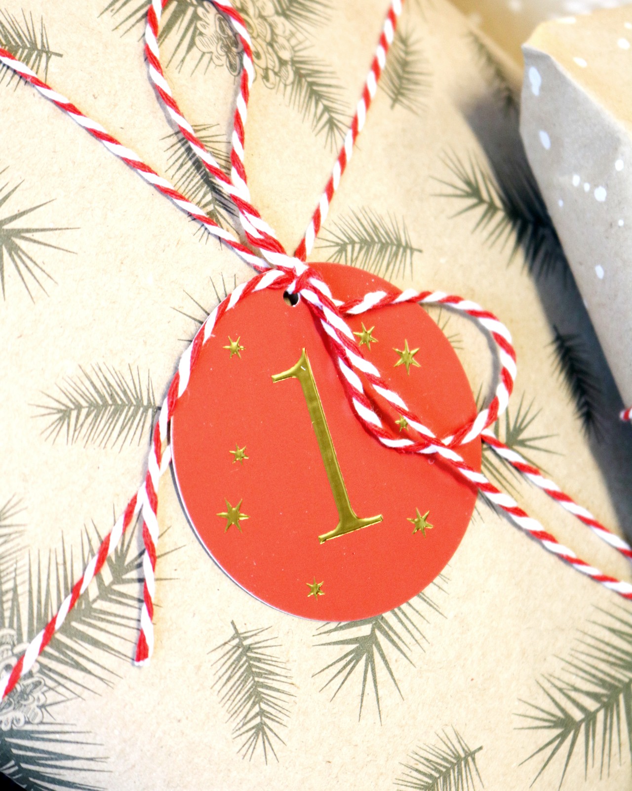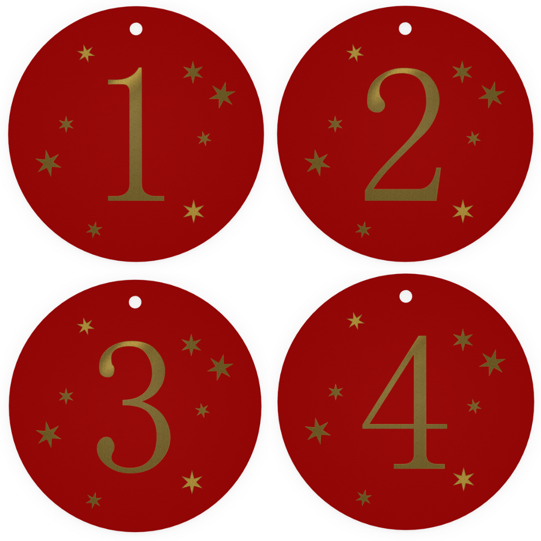 Pynt adventsgaverne med de fineste adventstal i blankt guldtryk på en mørkerødt gavemærke.